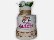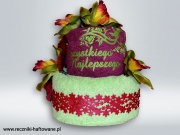 W skład zestawu wchodzą 2 ręczniki o rozmiarach 140/70 i 100/50 ułożone na kształt tortu oraz przyozdobione starannie dobranymi dekoracjami.