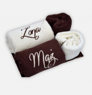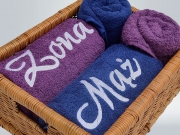 Personalizowany komplet składający się z 4 haftowanych ręczników. Możliwość umieszczenia dowolnego haftu na każdym z ręczników. Idealny prezent dla małżeństwa. Zestaw najczęściej wybierany jako prezent na ślub lub rocznicę ślubu.Ręczniki o wymiarach 140x70 i 100x50. Duży wybór kolorów sprawia, że ręczniki mogą być idealnie dopasowane do kolorystyki łazienki.
